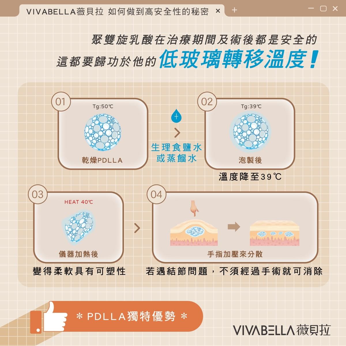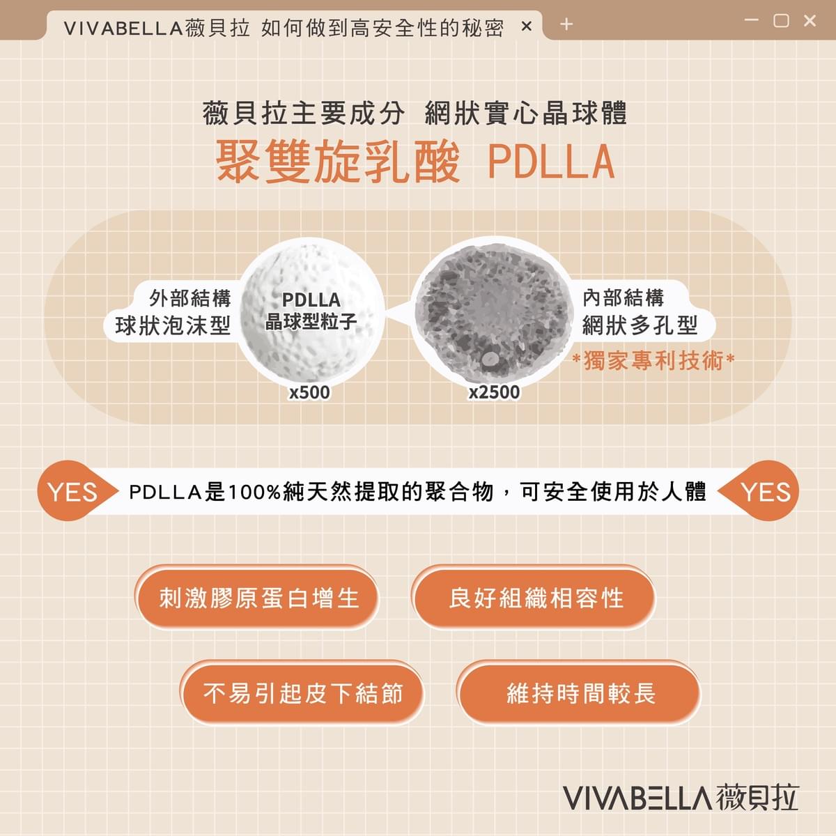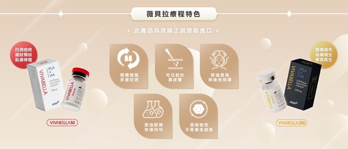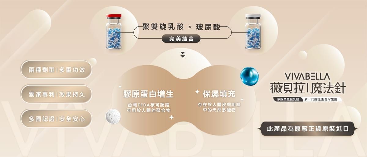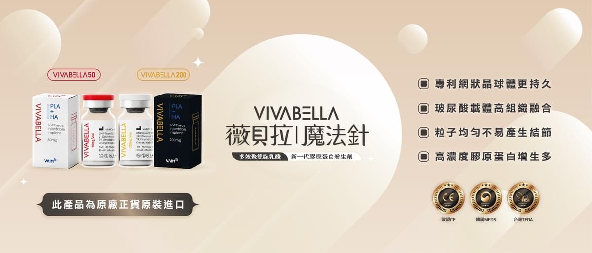 新一代的膠原蛋白增生劑-薇貝拉(VIVABELLA)正式名稱為「薇貝拉軟組織植入劑」,坊間又被喻為二代精靈針;與其他膠原蛋白注射劑較不同的是,薇貝拉(VIVABELLA)除了擁有「聚雙旋乳酸 PDLLA」成分之外,更結合了非交聯玻尿酸(non-crosslinked HA ) 晶體混合製成之產品,注射後便能立即改善全臉扁平、臉頰凹陷、法令紋等問題,加上薇貝拉乘載了非交聯玻尿酸,注射後相較其他品牌不容易產生結節問題,可以呈現自然又精緻的青春容顏。