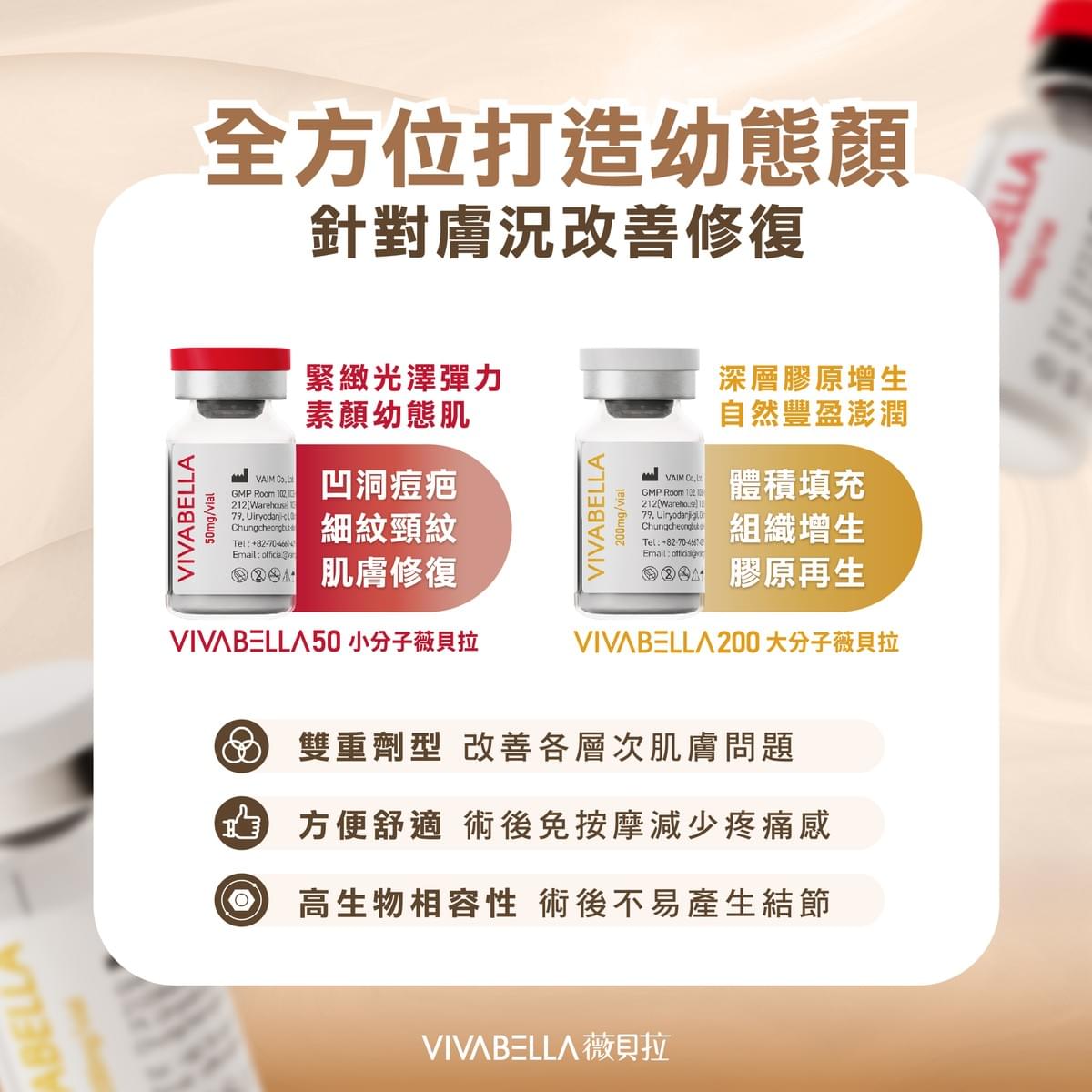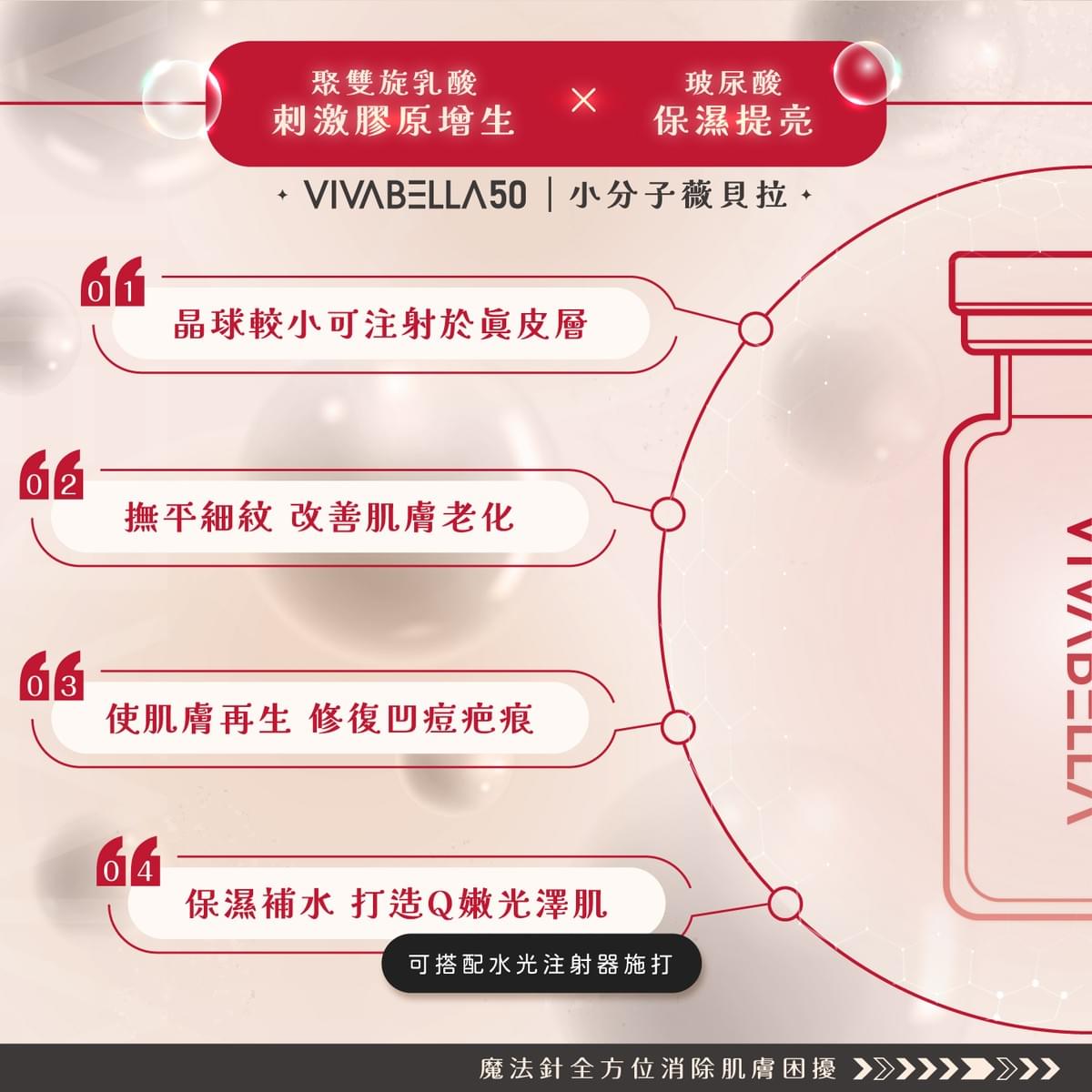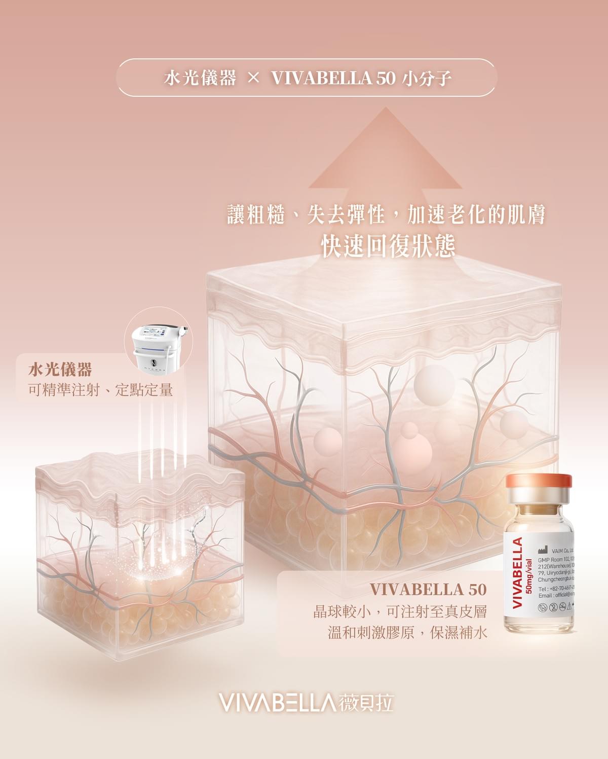 VIVABELLA 50 小分子薇貝拉,晶球較小,可注射於真皮層,使肌膚達到保濕補水、緊緻光澤;同時刺激自身膠原蛋白增生,撫平紋路、改善凹痘疤痕,養成素顏Q嫩美肌