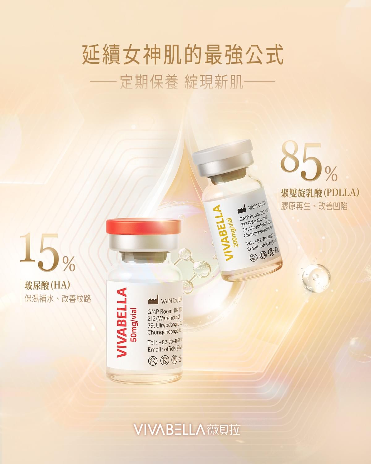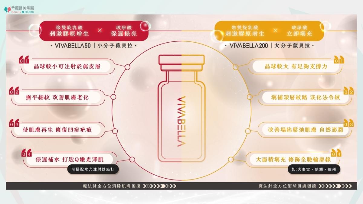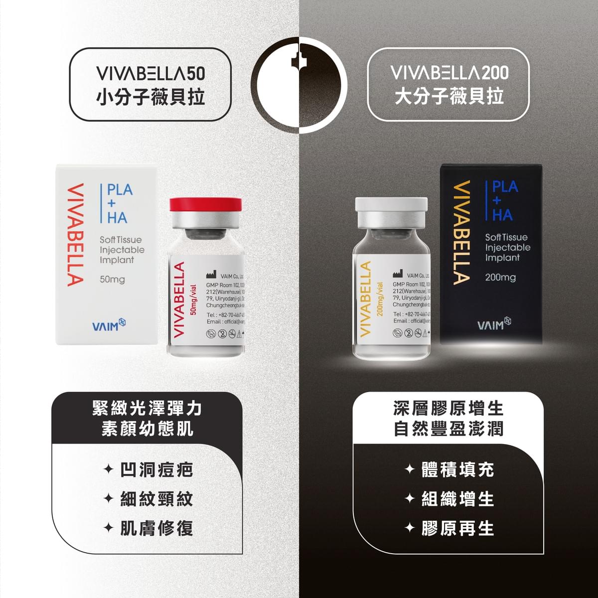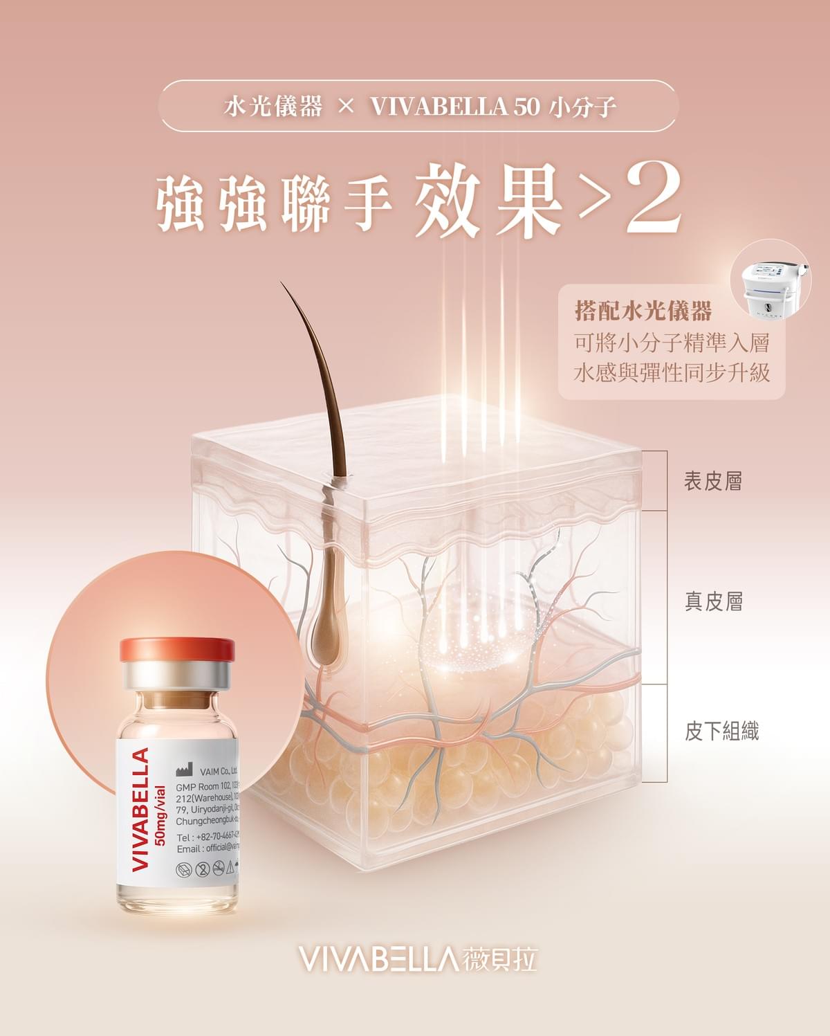 VIVABELLA 50 小分子薇貝拉,晶球較小,可注射於真皮層,使肌膚達到保濕補水、緊緻光澤;同時刺激自身膠原蛋白增生,撫平紋路、改善凹痘疤痕,養成素顏Q嫩美肌