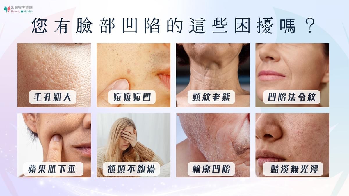 毛孔粗大 痘疤痘凹 頸紋老態 凹陷法令紋 蘋果肌下垂額頭不飽滿輪廓凹陷黯淡無光澤