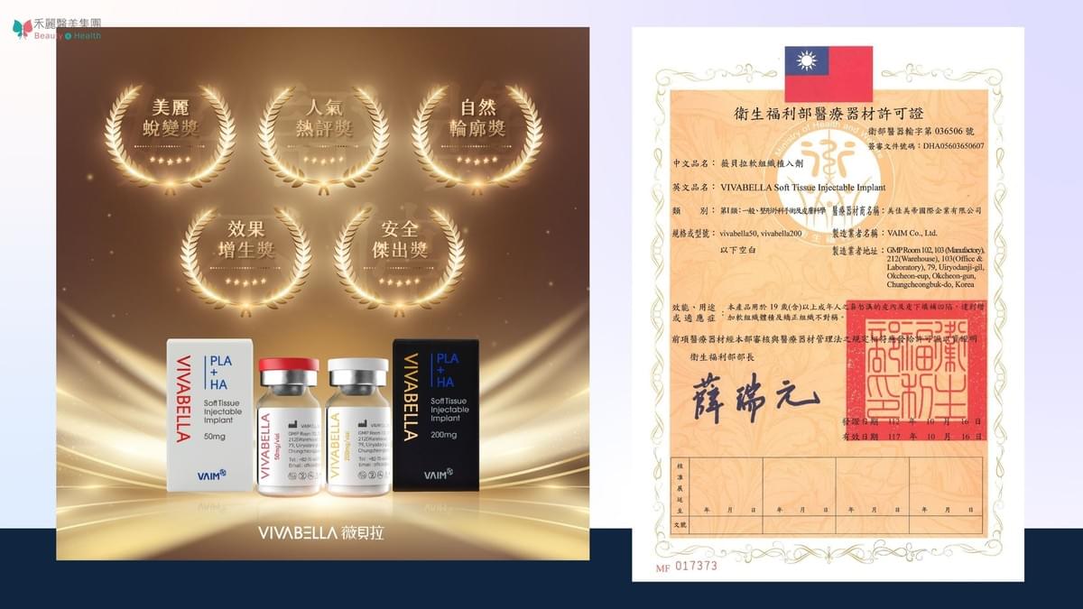 VIVABELLA 通過多國專業機構認證,獨創和專利認證的粒子形狀技術,獲得歐盟CE認證、韓國食藥署KFDA認證,更是第一個在台灣TFDA取得認證的「多效型膠原蛋白增生劑」,並獲得多家皮膚科診所推薦,品質與安全性均受到國際肯定。